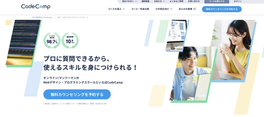 結論から言うと、CodeCamp(コードキャンプ)のWebデザインコースは、「講師の質が高く、初心者でも安心して学べる」と評判です。