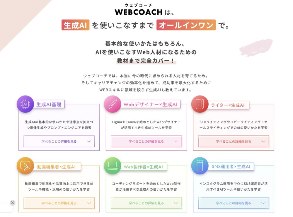 結論から言うと、WEBCOACHは「専属コーチと二人三脚で、実務レベルのWebスキルを身につけたい女性向けオンラインスクール」です。